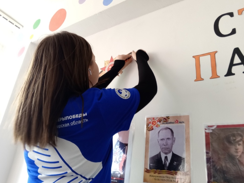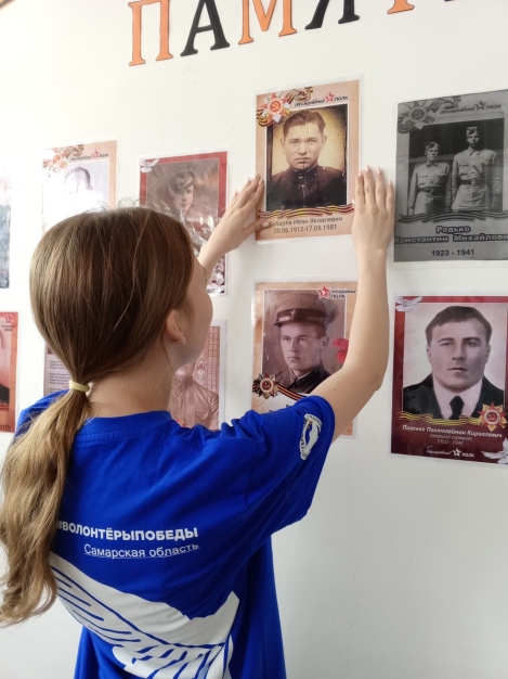 В Красноармейском районе Волонтёры Победы и лидеры местного отделения «Молодая Гвардия» оформили «Стену Памяти», разместив на ней портреты своих Героев.