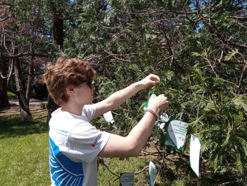 -организовали площадку Волонтёров Победы на выставке «Фронтовой полигон», на которой артековцы могли написать Письма Победы ветеранам, сделать из дерева георгиевскую ленту, изготовить голубя из бумаги или же написать имена своих Героев и повесить их на «Древо Памяти».