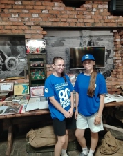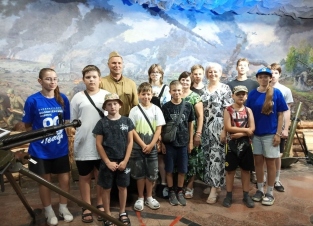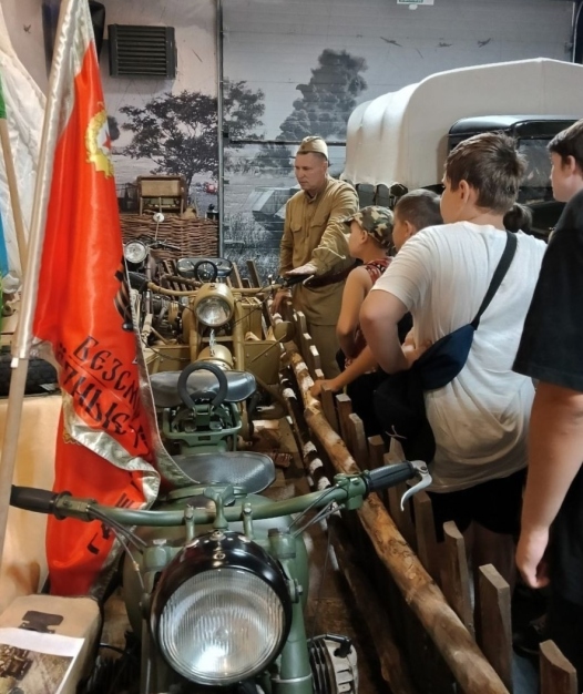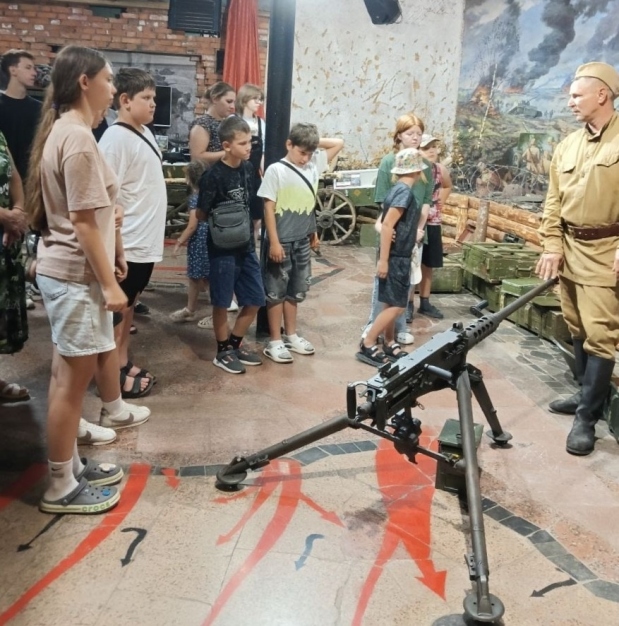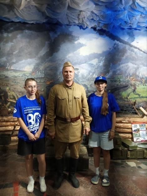 В музее представлены различные экспонаты, найденные на раскопках. Военной техники немного, но она в рабочем состоянии. Волонтёры и дети слушали рассказ экскурсовода о технике, её роли в боях и подвигах экипажей. Всё можно было потрогать: посидеть за рулём, сделать холостой выстрел. Особенно впечатлила многометровая панорама танковой битвы. Ребята также побывали в окопной землянке, воссозданной с большой точностью.