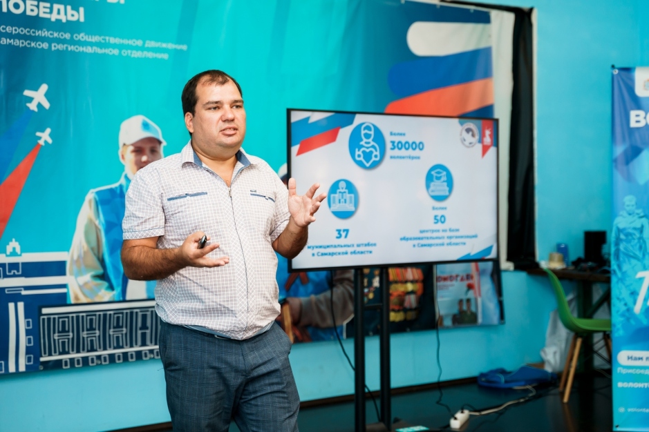 Участников тематического направления «Волонтёры Победы» посетил исполнительный директор СамРО ВОД «Волонтёры Победы», член Общественной палаты Самарской области — Сергей Андриянов.