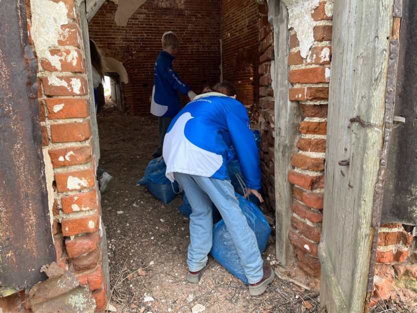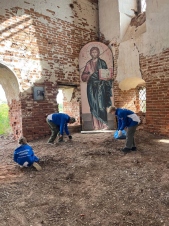 30 Волонтёров Победы в течение дня привели в порядок внутренние помещения церкви, а также территорию, прилегающую к храму: очистили её от бытового мусора, камней, сухих веток и прошлогодней листвы, скосили траву и расчистили двор храма от зарослей кустарников, скрывавших архитектурные элементы здания.
