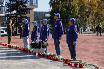 Перед началом официальной церемонии были возложены цветы к скульптурной композиции «Прощание» и «Монументу в честь Героев Советского Союза и полных кавалеров Ордена Славы». В часовню, посвященную героям, внесли лампаду с частицей Вечного Огня с Могилы Неизвестного солдата. Митрополит Барнаульский и Алтайский Сергий совершил обряд освящения, возведенной во имя святого Георгия Победоносца, и отметил торжественность и духовность события для Барнаула.