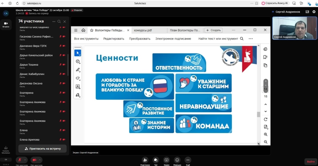 «На занятиях мы глубже знакомимся с направлениями работы нашего Движения, обсуждаем важные аспекты патриотического воспитания и сохраняем историческую память. Эта программа очень ценна для нас, волонтёров, так как она не только помогает развивать навыки организации мероприятий, но также объединяет единомышленников, готовых делиться опытом и идеями», — рассказала Сабина Бисенгалиева, участница из Кинельского района.
