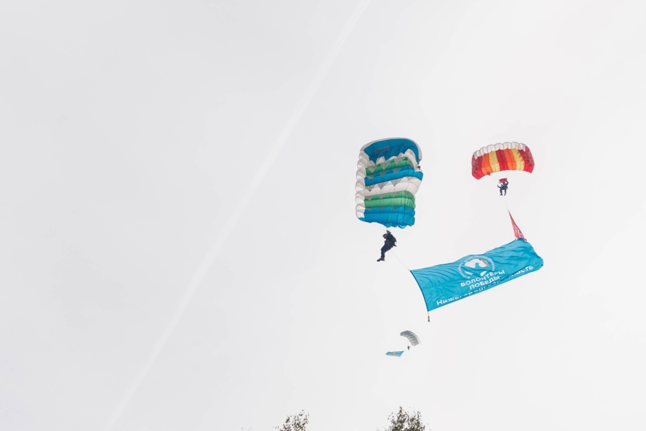 Волонтёры Победы Нижегородской области по-настоящему ярко и масштабно встретили День Государственного флага. Несколько десятков парашютистов совершили прыжки с высоты около 1000 метров и развернули в небе огромные флаги России и Волонтёров Победы (3 на 6 метров) во время парашютного прыжка. Акцию организовали и провели активисты местного отделения «Волонтёров Победы» совместно с воспитанниками военно-патриотического лагеря «Хочу стать десантником».