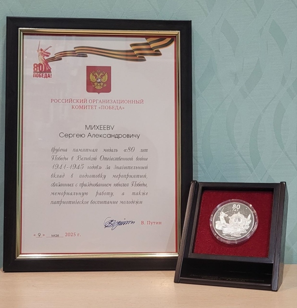 Региональный руководитель ВОД «Волонтёры Победы» Мурманской области, Сергей Михеев, награждён памятной медалью «80 лет Победы в Великой Отечественной войне 1941-1945 годов» за значительный вклад в подготовку мероприятий, связанных с празднованием юбилея Победы, мемориальную работу, а также патриотическое воспитание молодёжи.