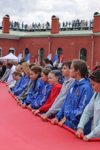 Только что на территории Петропавловской крепости завершилась молодёжная акция, посвящённая Дню государственного флага Российской Федерации. Несколько десятков Волонтёров Победы приняли участие в ней. Ребята развернули флаг России размером 30 на 50 метров.