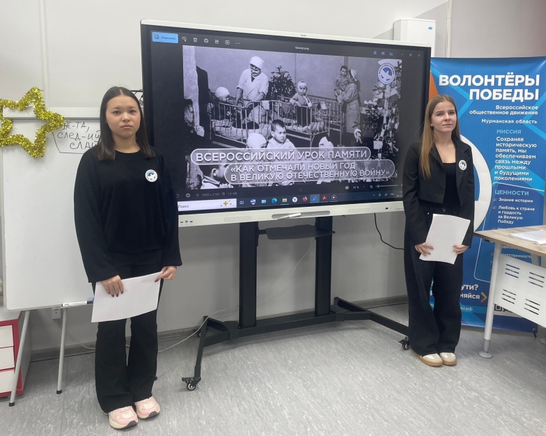 Волонтёры Победы Ковдорского муниципального округа организовали и провели среди обучающихся первого курса ГАПОУ МО «КПК» Всероссийский урок памяти «Как отмечали Новый год в Великую Отечественную войну». В ходе урока представили воспоминания ветеранов, архивные фотографии и документы, а также рассказы о том, как люди сохраняли традиции празднования Нового года даже в условиях войны.