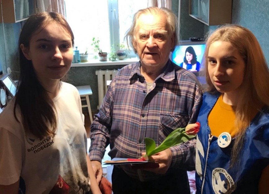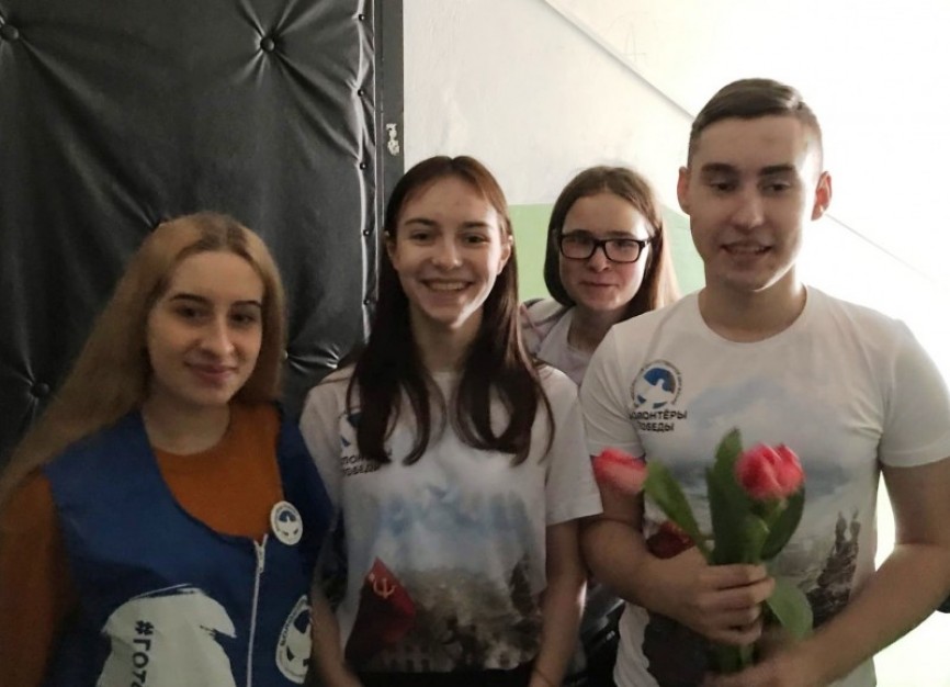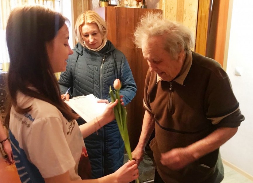 Вместе с медалью ветеранам вручали самодельные открытки, которые для них сделали школьники Ленинского района, и конечно символ весны - тюльпаны!