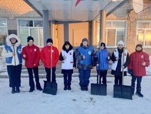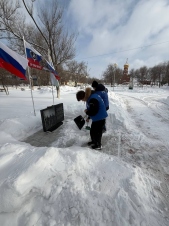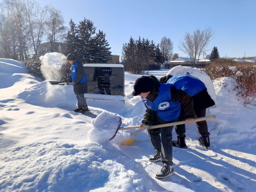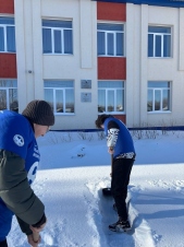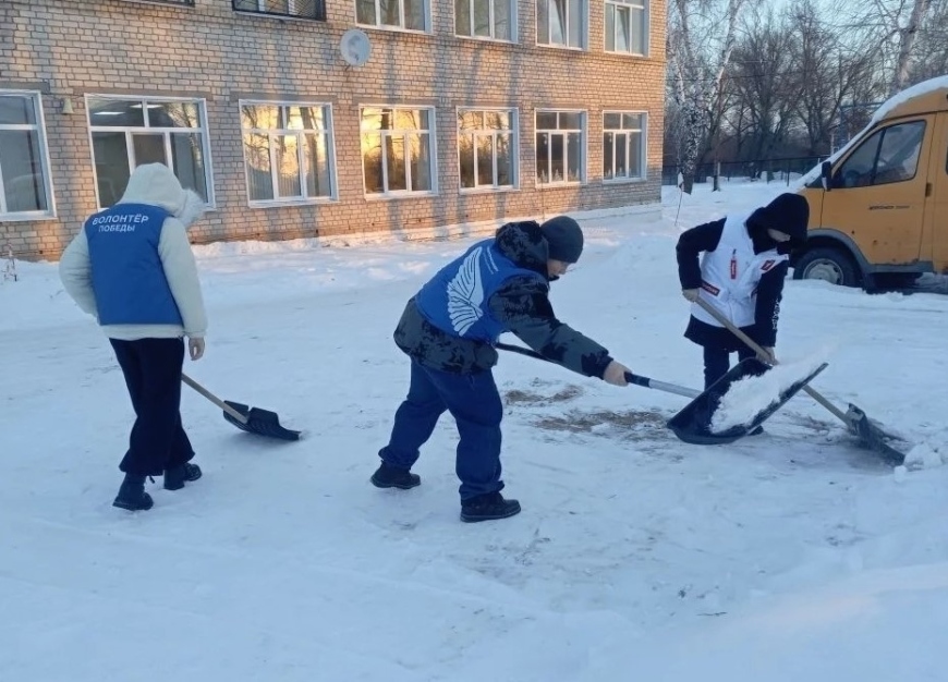 В селе Гвардейцы Борского района Волонтёры Победы и ребята из отряда «Горячие сердца» местной школы очищают общественные территории от снега и наледи, помогая сделать центральную площадь родного села и школьный двор чистыми и безопасными.