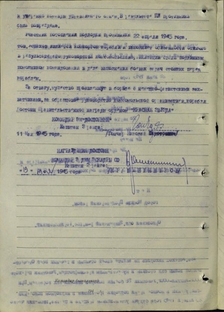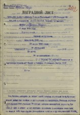 Из наградного листа к ордену Красной звезды: «Участник перехода СССР – Англия – СССР. Участник 38 боевых походов, выполняемых кораблем. При обнаружении в ночное время подлодки противника в надводном положении 25 января 1945 года будучи установщиком прицела и целика, выполнял четко и уверенно команды управляющего огнем. В результате подводная лодка противника была повреждена. Участник потопления подводной лодки противника 22 апреля 1945 года.»