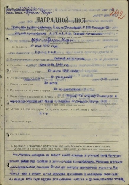 Астахов Гавриил Степанович родился 1 января 1919 года в поселке Горянковский Знаменского района Орловской области. В РККФ – с 23 марта 1939 года. На эсминце «Опытный» Гавриил Астахов защищал Ленинград с моря вплоть до прорыва блокады. Когда эскадренный миноносец получил серьёзную пробоину, экипаж отправили на передовую. Так матрос Астахов стал морским пехотинцем.