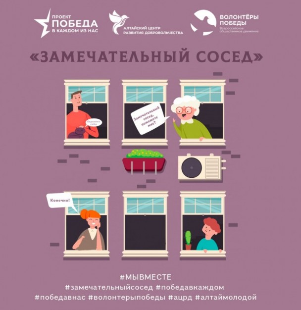Алтайское региональное отделение «Волонтеры Победы», проект «Победа в каждом из нас» и Алтайский центр развития добровольчества, в столь непростое время, предлагают соседям проявить заботу и ответственность по отношению друг к другу. Пожалуй, сейчас, как никогда, нам всем нужна поддержка, в том числе и соседская. К тому же, своей добрососедской поддержкой, вы можете стать помощником всероссийской акции взаимопомощи во время пандемии коронавируса #МЫВМЕСТЕ.