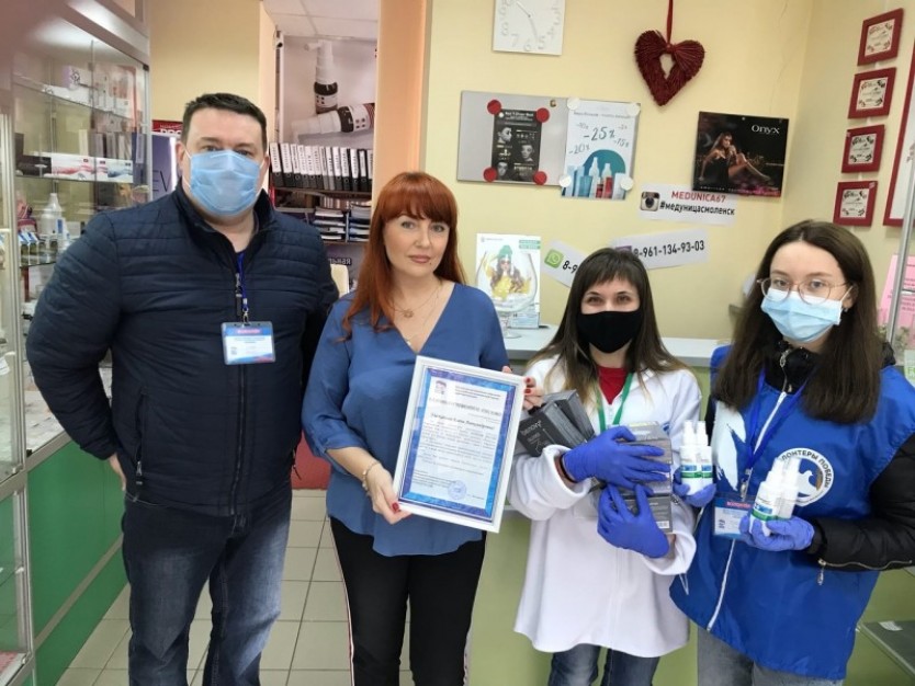 В пятницу сотрудники ИП Медуница безвозмездно передали СМОЛЕНСКОМУ ВОЛОНТЕРСКОМУ ЦЕНТРУ по оказанию помощи наиболее уязвимым в условиях распространения коронавирусной инфекции категориям граждан средства защиты (перчатки, маски и дезинфекторы). В знак признательности директору ИП Медуница волонтеры вручили благодарственное письмо.