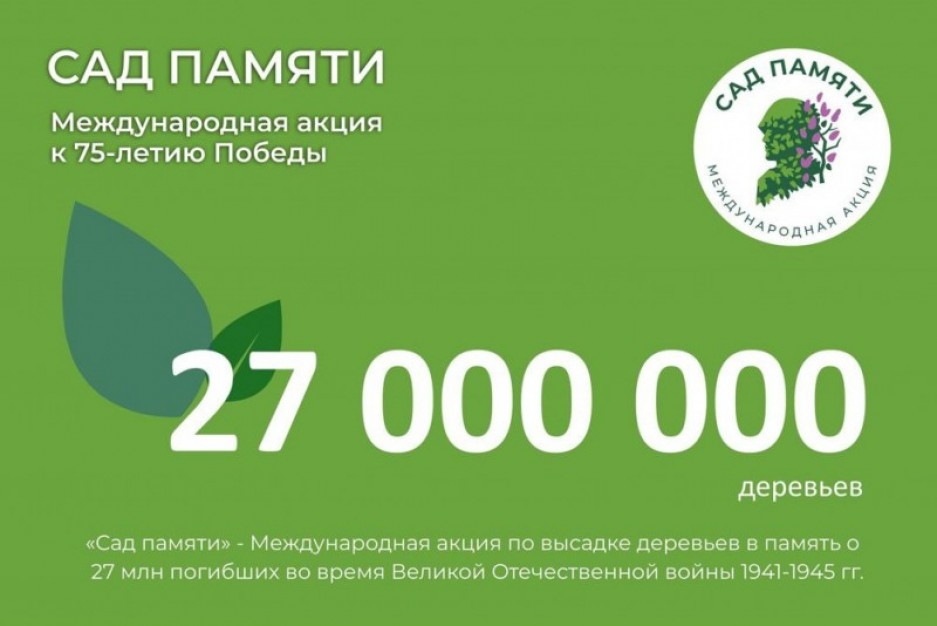 Международная акция "Сад памяти", приуроченная к 75-летию Великой Победы, в преддверии очередной, юбилейной даты.«Сад памяти» - международная акция, в рамках которой планируется высадить 27 миллионов деревьев в память о 27 миллионах погибших в годы Великой Отечественной войны. 27 миллионов человек отдали свои жизни за наше спокойное будущее. Наш долг сохранить и передать эту память следующим поколениям.Сад памяти — это место, где можно передать историю своей семьи детям и внукам, куда можно приходить чтить своих павших родственников. Это не просто акция, а закладывание новой традиции, которая призвана сохранить подвиг предков в веках.