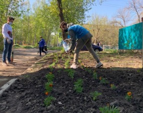 Ребята прибрались на придомовой территории многоквартирного дома и высадили бархотки.