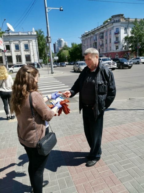 Волонтеры Победы Алтайского края 8 и 9 мая раздавали Георгиевские ленточки вместе с памятками о том, как правильно носить ленточку на улицах Барнаула: Георгия Исакова, пересечение Ленина - Матросова, Ленина - Молодёжная и на бульваре Защитников Сталинграда.
