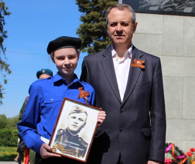 Валерия рассказала о своем прадедушке: «Воевал мой прадедушка по папиной линии Михаил Тимофеевич Литвиненко. Он родился 25 октября 1925 года на Украине. В декабре 1942 года в возрасте 17 лет он был призван в Красную Армию.