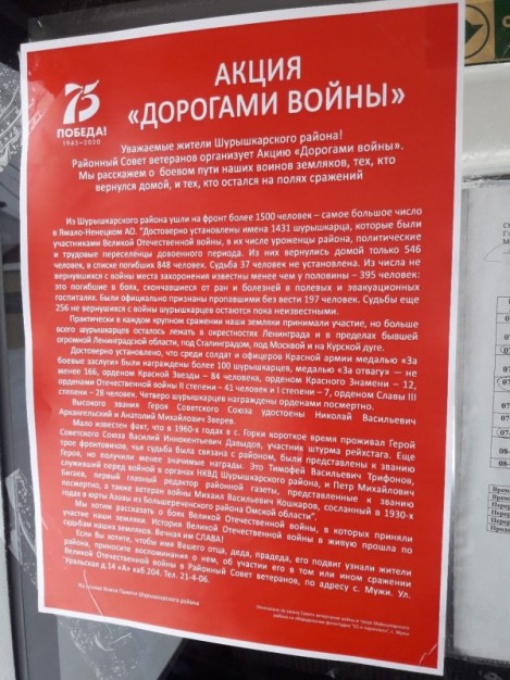 Сегодня добровольцы местного отделения ВОД «Волонтеры Победы приняли участие в районной акции «Дорогами войны». Волонтеры разместили в автобусе информационные плакаты о боевом пути воинов Шурышкарского района. Кто – то вернулся домой, а кто – то так и остался на полях сражений…