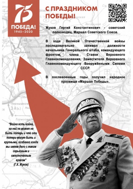 Жуков Георгий Константинович - советский полководец. Маршал Советского Союза (1943), четырежды Герой Советского Союза (1939, 1944, 1945, 1956), кавалер двух орденов «Победа» (1944, 1945). Родился 19 ноября (1 декабря) 1896 в с. Стрелковка, Малоярославецкий уезда, Калужской губернии в семье крестьянина. После окончания с похвальным листом трёх классов церковно-приходской школы летом 1908 года мать устроила сына в ученье к меховщику и владельцу небольшой скорняжной мастерской в Москве. В 13 лет, успешно освоив начальный курс скорняжного дела, самостоятельно поступает на вечерние общеобразовательные курсы на Тверской улице, которые давали образование в объёме городского училища. В августе 1915 года Жукова во время Первой мировой войны призывают в Императорскую армию. В 5-м кавалерийском полку 189-го запасного пехотного батальона и начинается его славная военная карьера полководца. В 1916 года откомандирован на Юго-Западный фронт. Участвуя в боевых действиях «за захват немецкого офицера» награждён Георгиевским крестом 4-й степени. В октябре получил тяжёлую контузию и вследствие частичной потери слуха направлен в запа́сный кавалерийский полк. С июня 1939 года Жуков — командующий 57-м особым армейским корпусом РККА на территории Монгольской Народной Республики. Разгром японцев в боях на Халхин-Голе рассматривается как один из ключевых факторов, повлиявших на решение Японии — отказаться от планов нападения на СССР вместе с Германией. Вечером 21 июня 1941 года Жуков, по воспоминаниям генерала И. В. Тюленева, командующего МВО в июне 1941 года, обзванивал округа и предупреждал командующих о возможном нападении Германии и её союзников в ближайшие сутки. В августе-сентябре 1941 года Г. К. Жуков, командуя войсками Резервного фронта, успешно осуществил первую в истории Великой Отечественной войны наступательную операцию. В апреле–мае 1945 года войска фронта под командованием Маршала Советского Союза Г. К. Жукова во взаимодействии с войсками 1-го Украинского и 2-го Белорусского фронтов успешно провели Берлинскую наступательную операцию. В ходе Великой Отечественной войны последовательно занимал должности начальника Генерального штаба, командующего фронтом, члена Ставки Верховного Главнокомандования, Заместителя Верховного Главнокомандующего Вооружёнными Силами СССР. Авторитет маршала Жукова и в армии, и в народе беспрецедентен. Он четыре раза удостоен звания Героя Советского Союза, награжден двумя высшими орденами «Победа», шестью орденами Ленина, орденом Октябрьской Революции, тремя орденами Красного Знамени, двумя орденами Суворова I степени, многими медалями и орденами иностранных государств, почетным оружием. Он – Герой Монгольской Народной Республики. За время войны Верховный Главнокомандующий в своих приказах 41 раз объявлял ему благодарность. В послевоенные годы получил народное прозвище «Маршал Победы». Министр обороны СССР (1955—1957). Член Президиума ЦК КПСС (29 июня—29 октября 1957). Депутат Верховного Совета СССР 1-го, 2-го, 3-го и 4-го созывов. В послевоенное время занимал пост Главкома Сухопутных войск, командовал Одесским, затем Уральским военными округами.