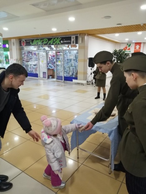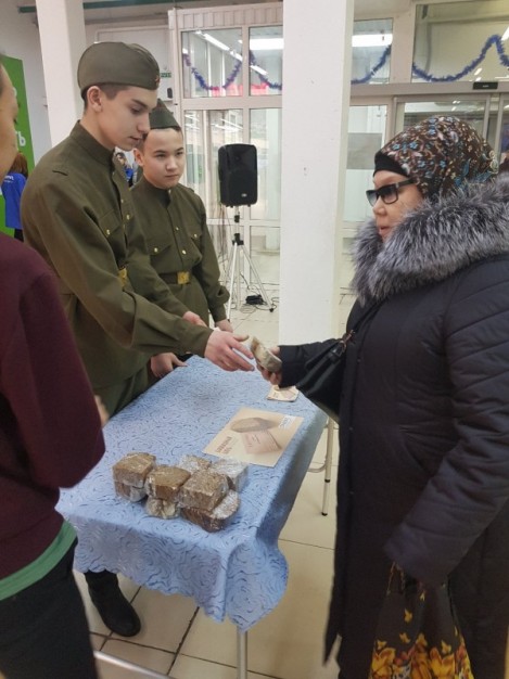 27 января 1944 года была снята блокада Ленинграда. Все мы знаем, как тяжело было людям, находившимся в блокадном городе. С каждым днем в городе таяли запасы продовольствия. Были сокращены нормы. Рабочие получали в день хлеба по 250 грамм, а служащие и дети по 125 грамм. Муки в этом хлебе почти не было, его выпекали из отраслей, мякоти, целлюлозы. Хлеб был почти единственным питанием ленинградцев. За время блокады города в нем погибло до полутора миллионов человек, большинство из них - от голода. В Салехарде «Волонтеры Победы» провели акцию «Блокадный хлеб» в ТЦ «Дискаунтер» и ТЦ «Апельсин». Ребята раздавали посетителям информационные листы и хлеб, по весу равный суточной норме тех времен — ровно 125 граммов. В поддержку акции студенты Ямальского многопрофильного колледжа выступили для жителей и гостей акции с театрализованной постановкой «Рассказы об ужасах блокады». Многие участники акции не смогли сдержать слёз.