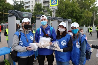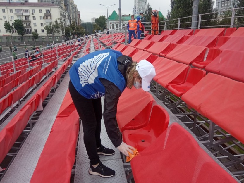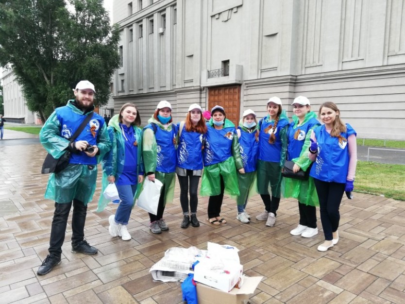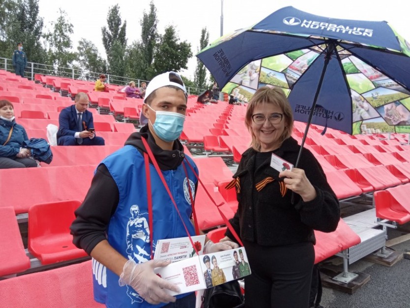 Добровольцы работали со зрителями - в части информирования, навигации и соблюдения «масочного режима». Кроме того, помогали в навигации у контрольно пропускных пунктов, вручали на всех трибунах георгиевские ленточки и памятные значки, а также провели акцию «Красная Гвоздика».