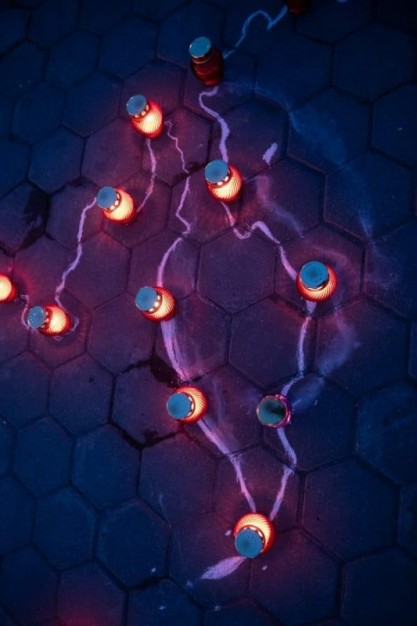 Вместо массового возложения лампад, Волонтёры Победы в нашей стране и за её пределами выстроили из них «Огненные картины», объединённые общей фразой «Помним».