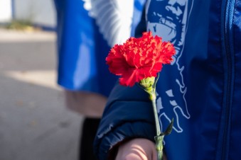 В завершении экскурсии волонтёры возложили цветы к памятнику легендарному штурмовику Ил-2.