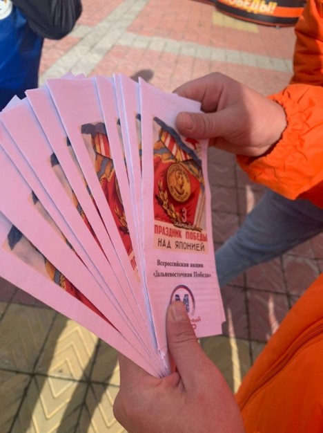 Волонтеры Победы вышли на улицы своих поселений для того, чтобы рассказать о заключительном этапе Второй мировой войны и об истории ленты-медали «За Победу над Японией». В ходе Всероссийской акции «Дальневосточная Победа» волонтерами нашего района были розданы информационные листовки и муаровые ленты.