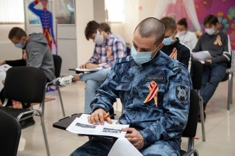 В вестибюле музея гостей встречает небольшая группа одетых в белые толстовки волонтеров Победы. Одни измеряют бесконтактным градусником температуру тела у вошедших, другие обрабатывают им руки антисептиком, третьи раздают маски. У кого-то из волонтеров отдельная миссия – раздавать гостям муаровые ленты бордово-бело-желтой расцветки. Это цвета орденской планки медали «За победу над Японией». Ведь сам диктант проходил 3 сентября – в этот день 75 лет назад Красная армия окончательно разбила японских милитаристов и Вторая мировая война была завершена.