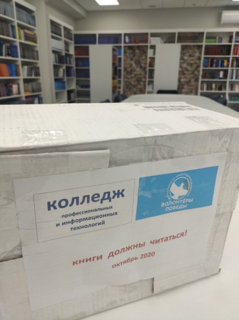 Волонтёры Победы Ноябрьска передали Колледжу информационных технологий коробку со специализированной литературой (учебники по физике, математике и др. для средне специальных учреждений).