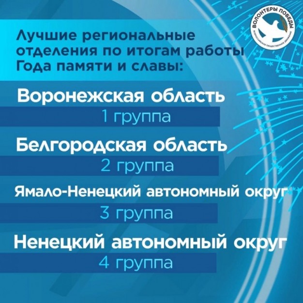 В ходе семинара-практикума руководителей региональных отделений ВОД «Волонтёров Победы» были объявлены лучшие из лучших. В зависимости от количества населения в первой группе регионов Воронежская область заняла первое место.