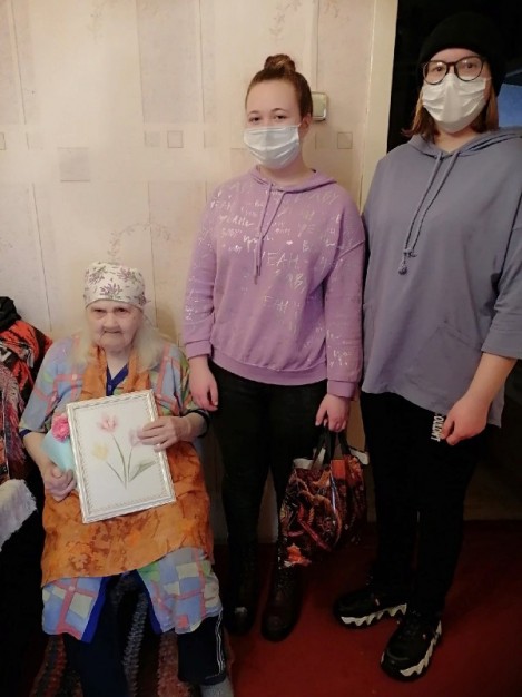 Добровольцы вручили Анне Максимовне открытки и подарки, сделанные своими руками, но самое главное - подарили внимание и заботу одинокой бабушке.