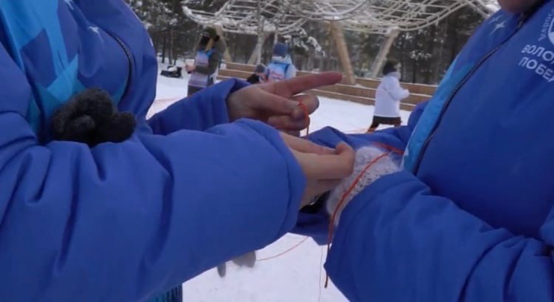 Волонтёры Ноябрьска создали два больших круга, передавали оранжевые клубки друг другу и произносили слова, которые ассоциируются с акцией. Получились две оранжевые паутины. В конце каждый участник акции отрезал от общей паутины кусочек нитки, повязывал себе или другому участнику со словами пожеланий.