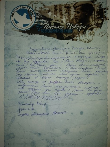 Обучающиеся школ и средних профессиональных образовательных организаций Республики Карелия принимают участие в Международном проекте «Письмо Победы». Хочется отметить активное участие в акции обучающихся Петрозаводского автотранспортного техникума, учащихся Лицея№1 и школы №43 города Петрозаводска. Любой желающий может написать теплые слова героям, чтобы проявить заботу и сказать спасибо лично. К акции подключаются не только жители России, но и представители других стран. Целью проекта является патриотическое воспитание молодежи и сохранение исторической памяти о Великой Отечественной войне путем написания благодарственных писем и поздравлений ветеранам. Все письма будут доставлены волонтерами регионального отделения ВОД «Волонтеры Победы»участникам войны ко Дню Победы в рамках адресной помощи ветеранам и благотворительного проекта «Мобильные бригады помощи участникам и инвалидам Великой Отечественной войны» во время поздравления и вручения подарков.