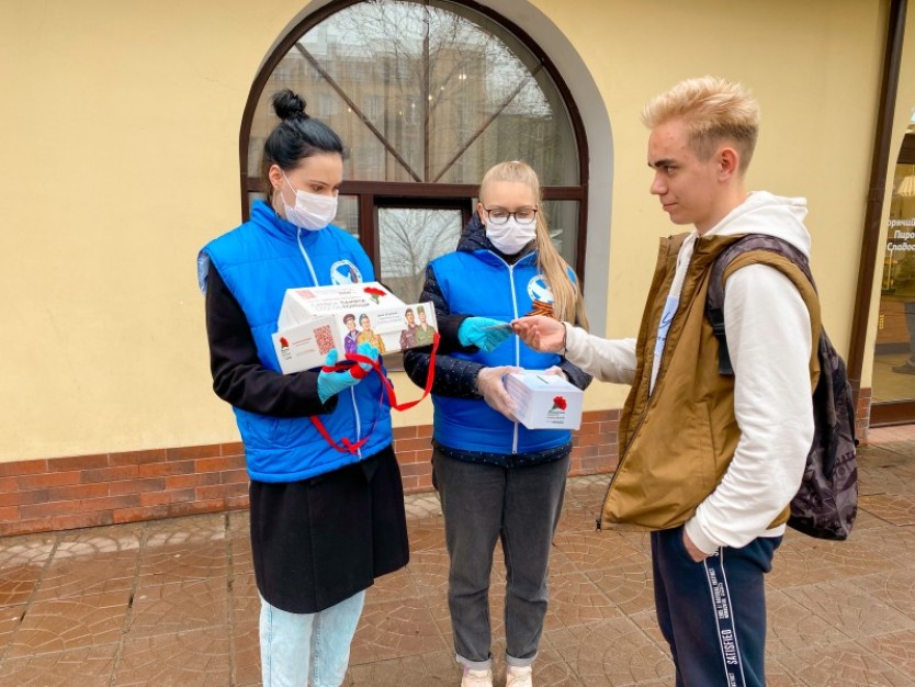 Поучаствовать в «Красной Гвоздике» может каждый. В парках и многолюдных местах стоят Волонтёры Победы с боксами: достаточно опустить пожертвование и получить взамен символ памяти - значок красной гвоздики.
