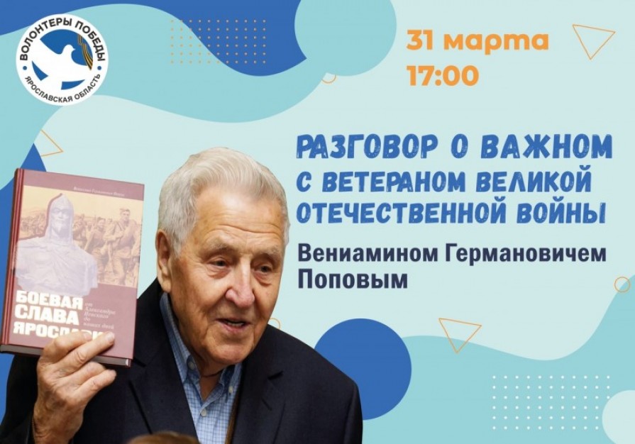 Лариса предложила 31 марта провести телемост между нами и Ветераном Великой Отечественной войны - Вениамином Германовичем Поповым. Телемост прошёл 31 марта в 17:00 на платформе Zoom. Вениамин Германович рассказал школьникам и студентам Ярославской области о своём жизненном пути, непростых буднях военного времени и важности истории в современном мире, ведь он написал 9 книг, направленных на патриотическое воспитание подрастающего поколения.