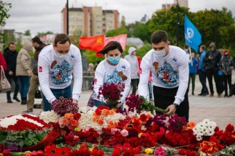 В День Победы добровольцы почтили и память погибших воинов-освободителей. На площади Победы волонтеры возложили цветы