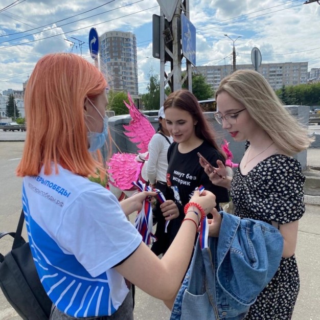 Жители и гости города с удовольствием принимали ленточки, а волонтеры были рады поздравили граждан с праздником.