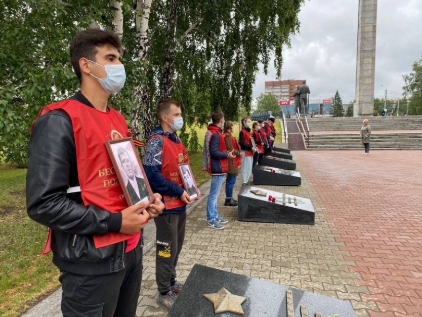Почетным караулом у плит с землей 13 городов-героев стояли представители патриотических молодежных объединений с портретами красноармейцев, уроженцев Алтайского края, погибших на фронтах в годы Великой Отечественной войны, чьи захоронения были найдены в ходе поисковых экспедиций «Вахта Памяти».
