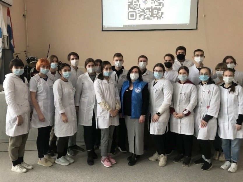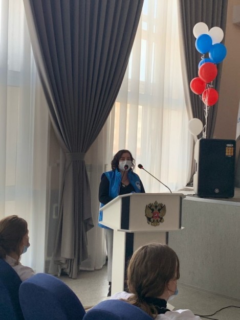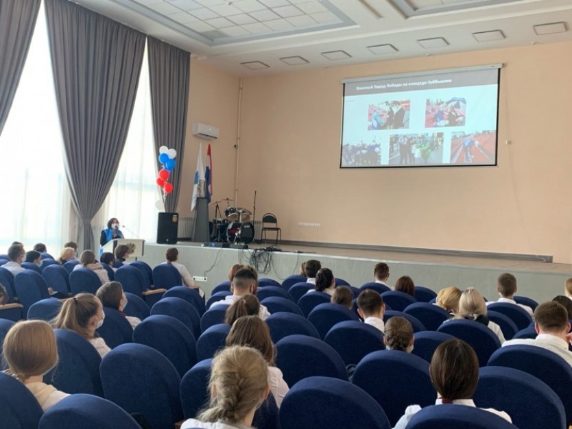 Заместитель председателя регионального отделения Движения Анастасия Самыкина рассказала студентам о движении «Волонтеры Победы», его целях и задачах, направлениях деятельности. Также рассказала о проведенных всероссийских и международных акциях.
