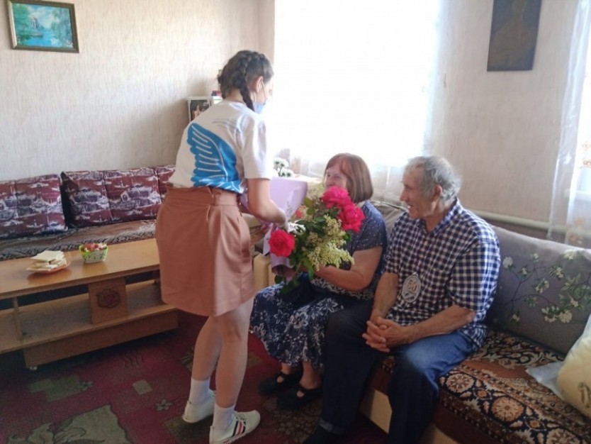 Волонтёры Победы города Алейска Уколова Ксения и Вардугина Полина совместно с активистами проекта «Победа в каждом из нас» накануне Дня семьи, любви и верности вручили цветы и подарки супружеским парам, отметившим Золотую свадьбу в этом году, и поздравили молодую многодетную семью с рождением 4-го ребёнка.