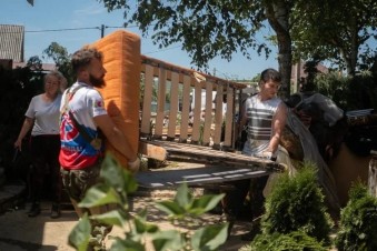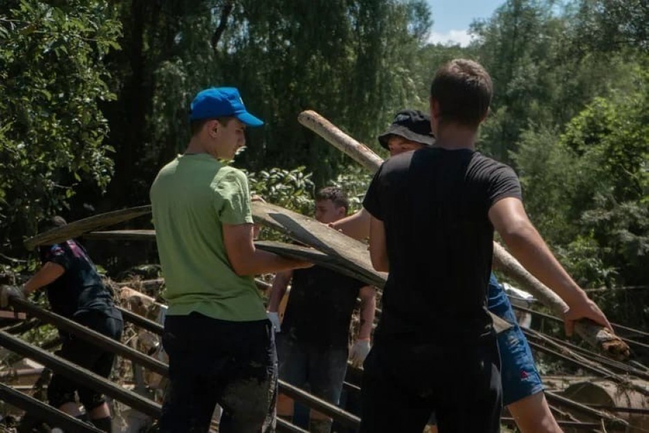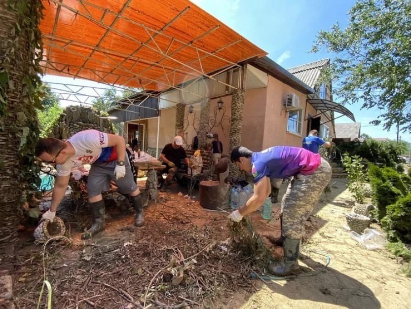 Волонтеры помогают жителям очищать територию от остатков ила, разбирать завалы, образовавшиеся в результате стихийного бедствия и выносить остатки вещей и мебели.