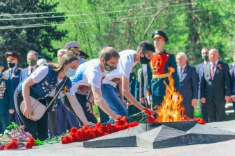 У Монумента Воинам-землякам, погибшим в годы Великой Отечественной войны, прошел торжественный митинг, посвященный 76-ой годовщине Победы советского народа в Великой Отечественной войне. Волонтеры Победы отрядов городских школ г. Николаевска и ПУ №44 провели акцию «Георгиевская ленточка» и раздали участникам митинга символы Победы.