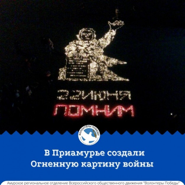 В ночь с 21 на 22 июня 2021 года на площади Победы в Благовещенске активисты Всероссийского общественного движения «Волонтеры Победы» совместно с «Молодой Гвардией» выложили из горящих свечей композицию «Родина-мать зовет» вместе с датой начала войны и словом «Помним».