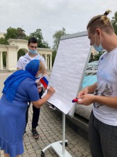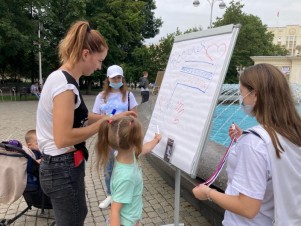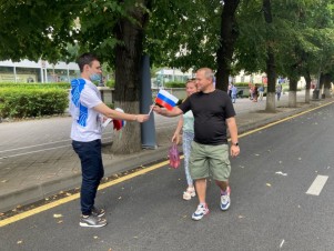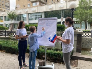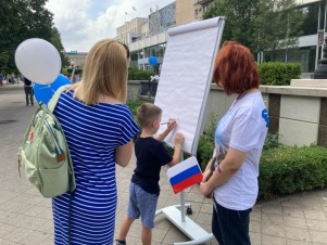 Волонтеры Победы Краснодарского местного отделения Движения вышли на улицы города, чтобы поздравить граждан с праздником. Любой желающий мог получить флажок, а также нарисовать то, с чем ассоциируется у них данный праздник.