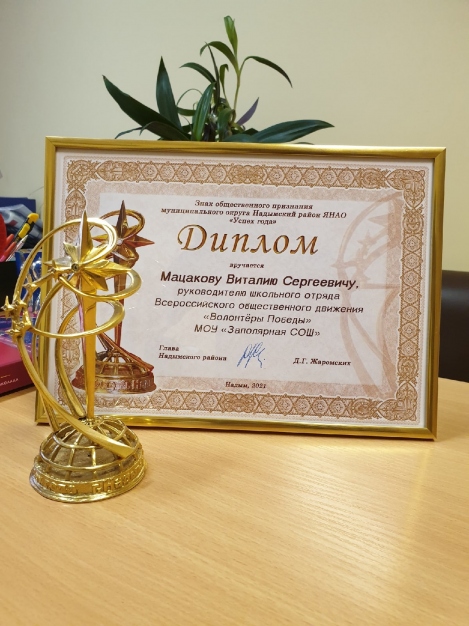 Надымском районе есть традиция чествовать тех, кто внёс значительный вклад в укрепление авторитета не только района, но и Ямало-Ненецкого округа в целом. Значимую награду в виде Полярной звезды из позолоченной бронзы с вкраплением фианитов за результативную деятельность, значительный вклад в успешное развитие и достижения в различных сферах деятельности получили девять жителей и коллективов муниципалитета, среди которых руководитель школьного отряда Всероссийского общественного движения Волонтеров Победы, учитель истории МОУ «Заполярная СОШ» Виталий Сергеевич Мацаков.
