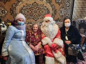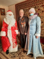 Одними из первых новогодние поздравления и подарки получили ветераны Великой Отечественной войны Алюшкина Мария Никитична и Болычев Виктор Андреевич. Волонтеры Победы вместе с Дедом Морозом и Снегурочкой пожелали ветеранам крепкого здоровья, бодрости духа и исполнения желаний.
