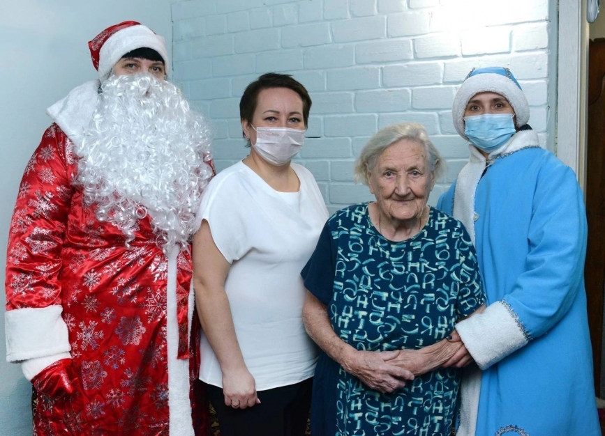 Так, региональный руководитель Дарья Терёхина и координатор направления «Связь Поколений» Алина Гирфанова поздравили с Новым годом Надежду Николаевну Петрову, которая летом отметит свой 100-летний юбилей. В годы войны она работала радисткой-телефонисткой сначала на Кольском полуострове, затем была переброшена под Кострому, а после завершения Великой Отечественной войны была направлена на Дальний Восток, где шла война с Японией. В своём возрасте она сохраняет бодрость и положительный настрой, а также с удовольствием рассказывает стихотворения для гостей.