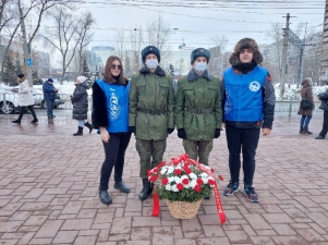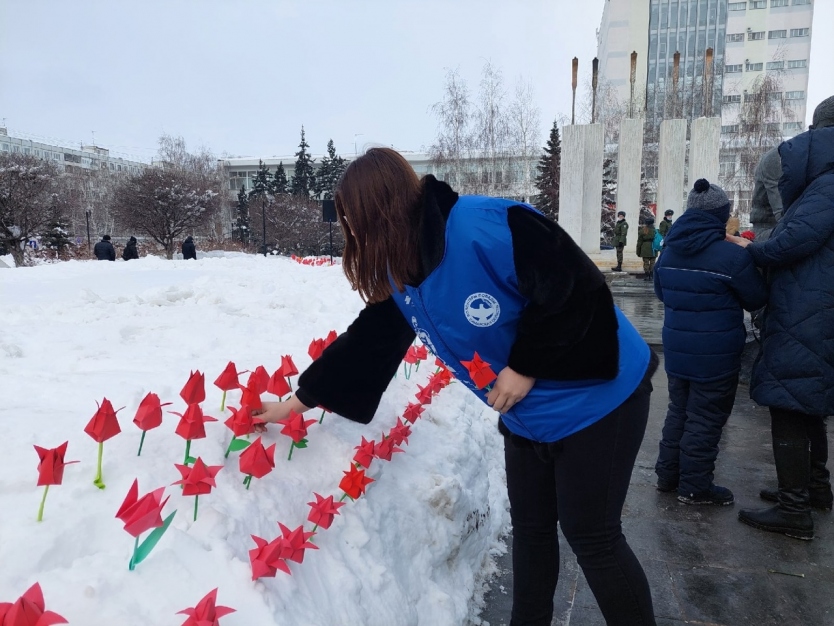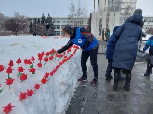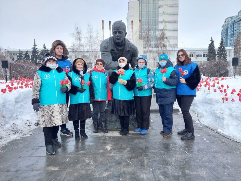 Перед началом церемонии активисты общественных центров гражданско - патриотического воспитания студенческой молодежи движения «Волонтеры Победы» и «серебряные» добровольцы присоединились к акции «Красный тюльпан».