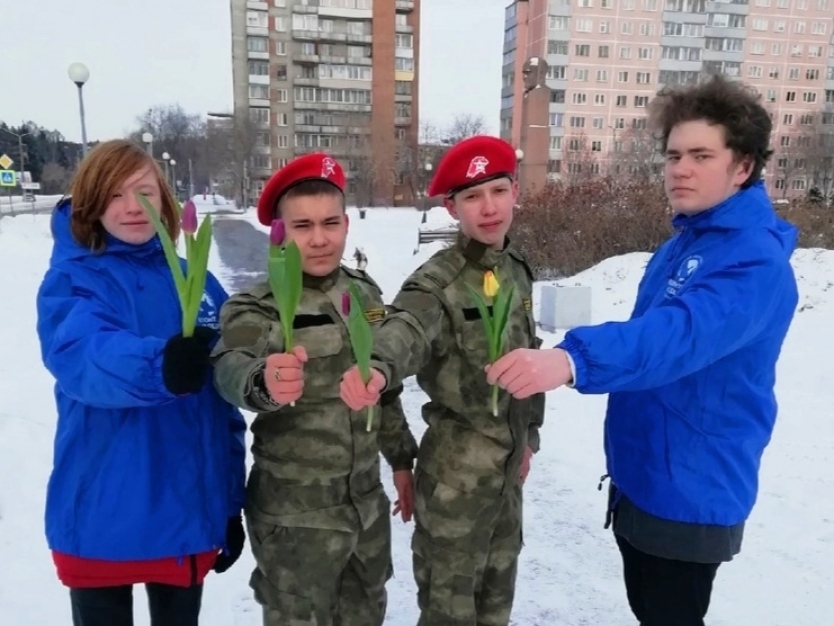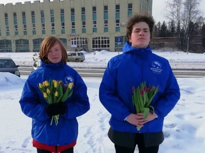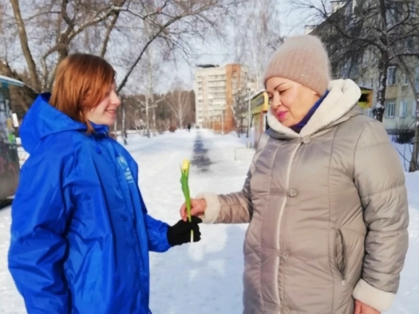 Участники движений «Волонтеры Победы» и «Юнармия» ЗАТО г. Железногорска поздравили представительниц прекрасного пола с праздником и подарили им цветы.